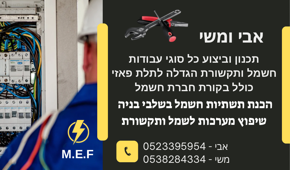 אנחנו M.E.F, עסק משפחתי של אב ובן, שמביאים יחד ניסיון של למעלה מ־30 שנה בתחום עבודות החשמל. מאחורינו מאות פרויקטים – מבנייני מגורים, דרך וילות יוקרה ועד דירות חדשות וישנות – עם מטרה אחת: לספק עבודה ברמה הגבוהה ביותר, עם יחס אישי לכל לקוח. הגישה שלנו ברורה: לא מתפשרים על בטיחות, דיוק, איכות חומרים ומקצועיות. בין אם מדובר בפרויקט של תשתיות מהיסוד או התקנה פשוטה של גוף תאורה – אנחנו ניגשים לכל עבודה באותה הרצינות. אוהבים את מה שאנחנו עושים – וזה ניכר בכל ביקור, בכל חיווט ובכל נקודה. אנחנו לא רק מבצעים – אנחנו מסבירים, מייעצים, בודקים שהכול עובד כמו שצריך, ומשאירים אחרינו בית מואר, בטוח ושקט נפשי. הלקוחות שלנו יודעים: יש על מי לסמוך, מהשיחה הראשונה ועד הסיום. אמינות, זמינות, אדיבות, ואחריות מלאה על כל עבודה. זו לא סיסמה – זו הדרך שלנו לעבוד. M.E.F כאן בשבילכם – בכל עבודה, בכל שלב, בכל גודל של פרויקט.